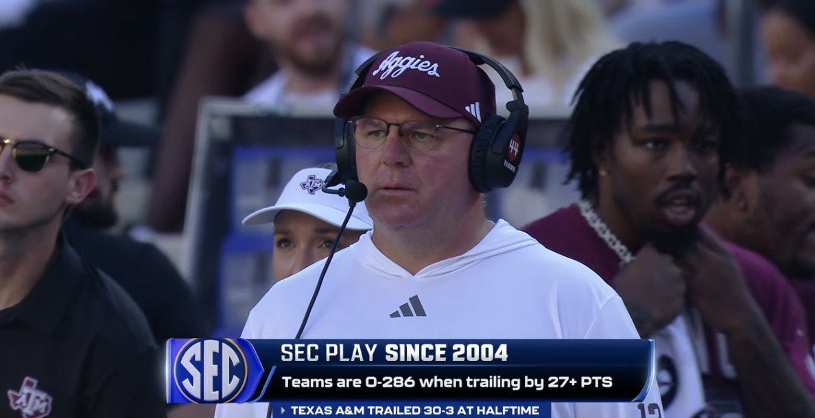 And yet, there was a halftime to reset and have your head coach – he of the new contract extension that was leaked just hours before the game – address the team. I suppose we over-rate halftime speeches, but I would give a few dollars to hear what Mike Elko said to his team that just laid the stinkiest egg imaginable in this early start where the Aggies had everything on the line and had fallen behind by four touchdowns.
